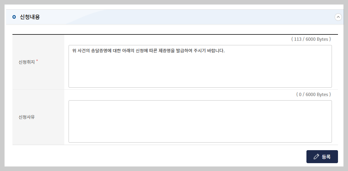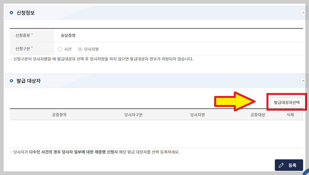 위쪽에 보이는 당사자 중 송달증명의 대상을 선택하고, '등록' 버튼을 눌러주세요.