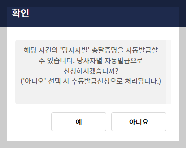 송달증명 대상이 잘 표시되었나 확인하고 '확인' 버튼을 클릭!!