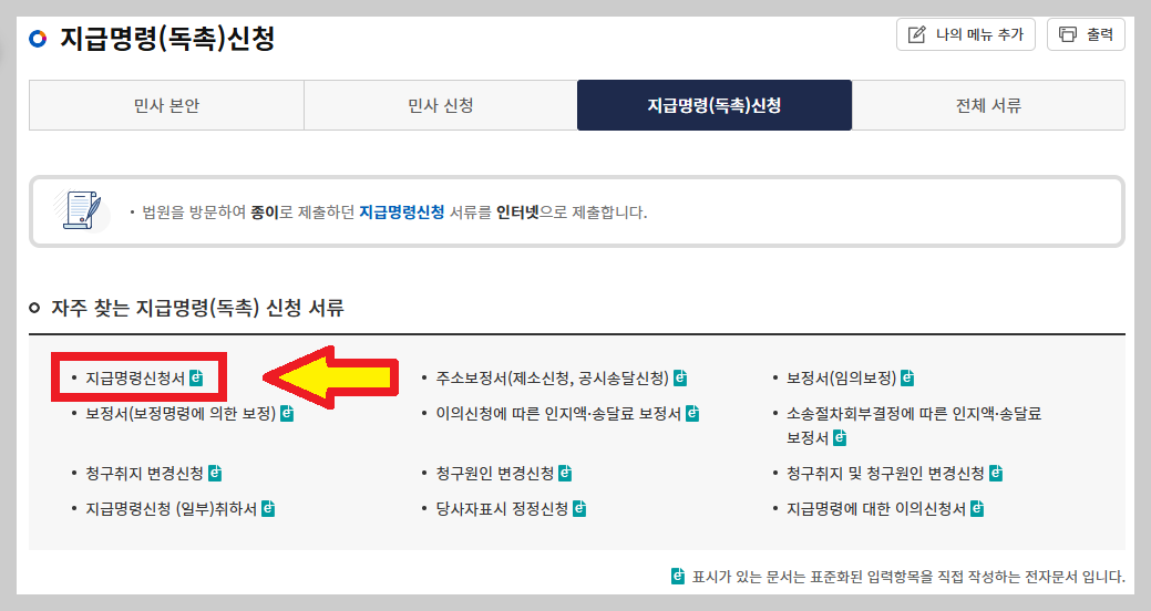 위 왼쪽 화면이 보이시면 '지급명령신청서'를 클릭하고 넘어가세요.