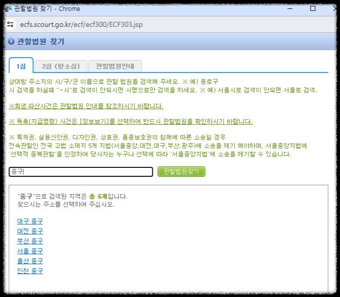 그 전에 먼저 '관할법원 찾기'를 클릭하여 법원을 선택하여 줍니다.