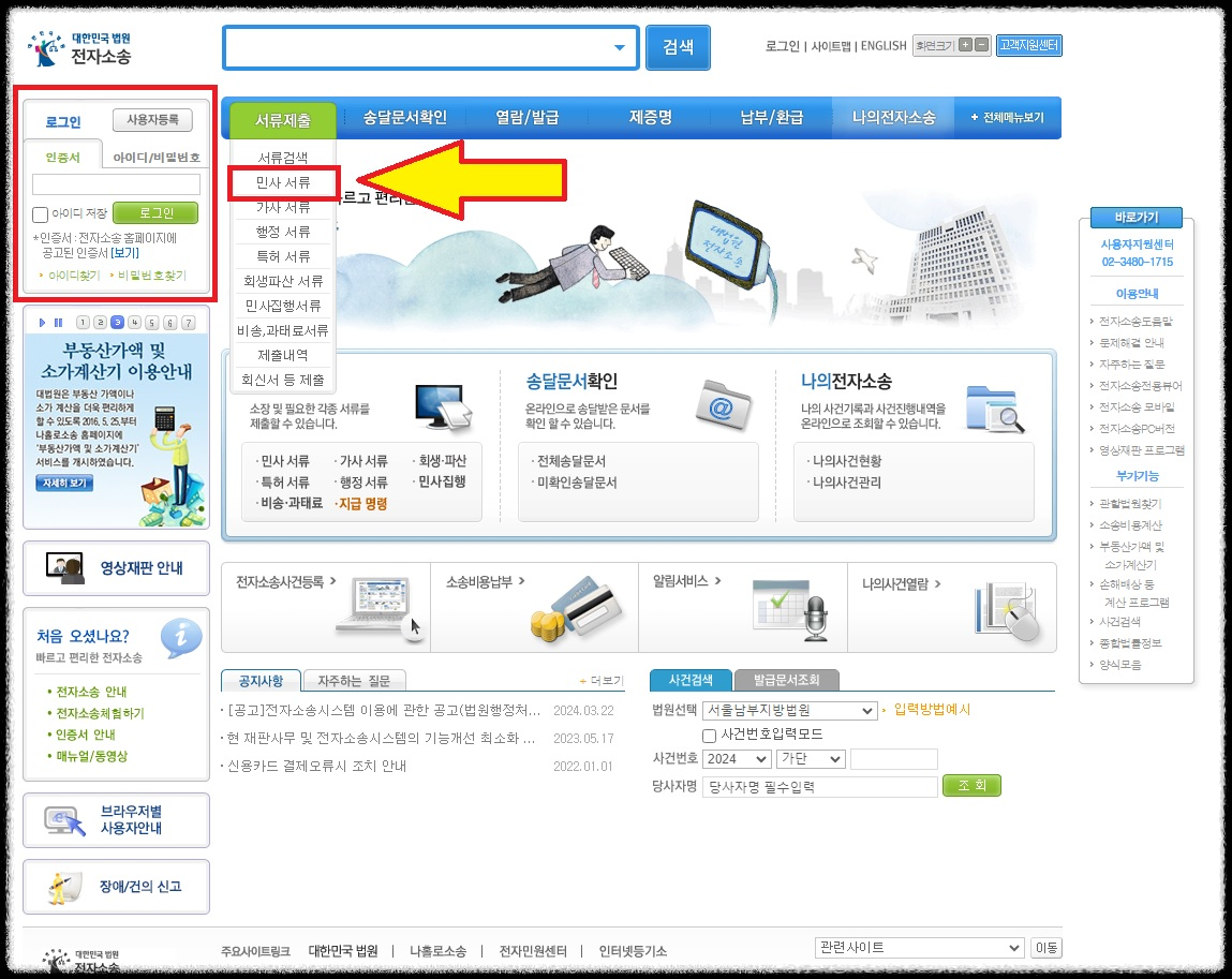 ① 법원 전자소송 사이트(https://ecfs.scourt.go.kr/)에 접속하여 로그인한 후, '민사서류' 탭으로 들어갑니다.