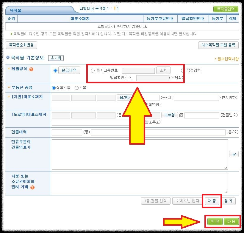 '목적물 입력' 버튼을 클릭합니다.