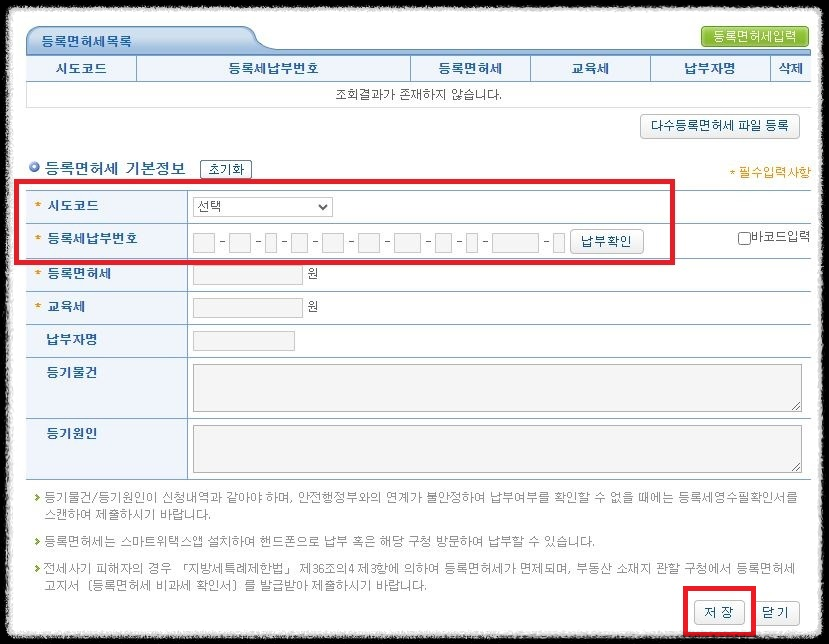 '시도코드'를 선택 후 '등록세납부번호'만 입력하면 나머지는 자동적으로 입력이 됩니다.