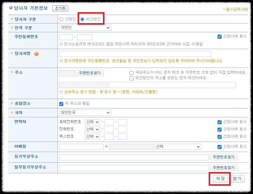해당 부동산이 공동명의인이라면, 공동명의인을 피신청인란에 추가하여 모두 적어줍니다.