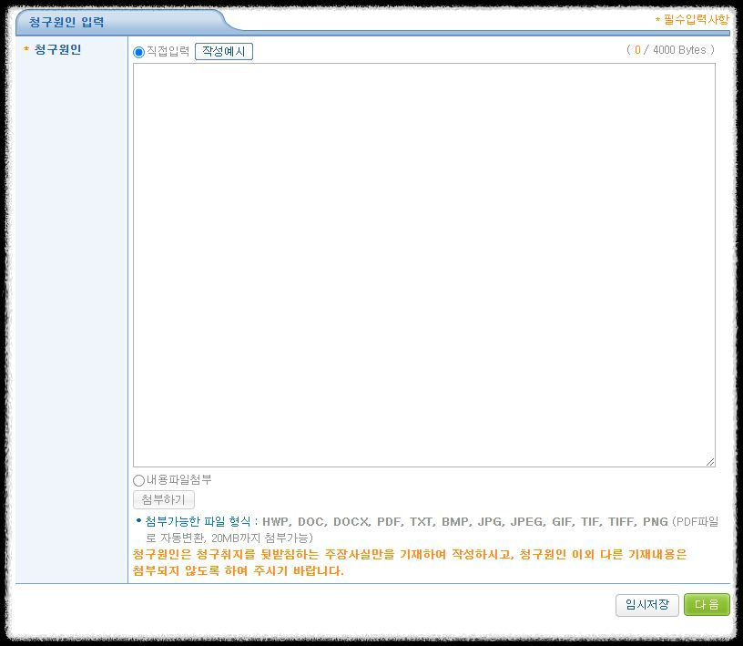 '청구원인 입력'란도 미리 작성하여둔 내용을 기재합니다.