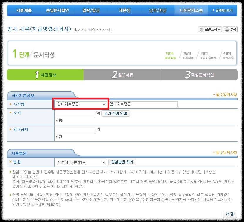 먼저 '사건기본정보'란에서는 사건명을 '임대차보증금'으로 선택하고,