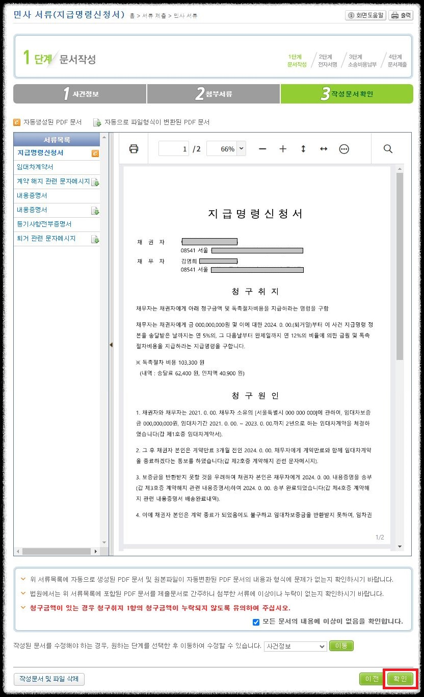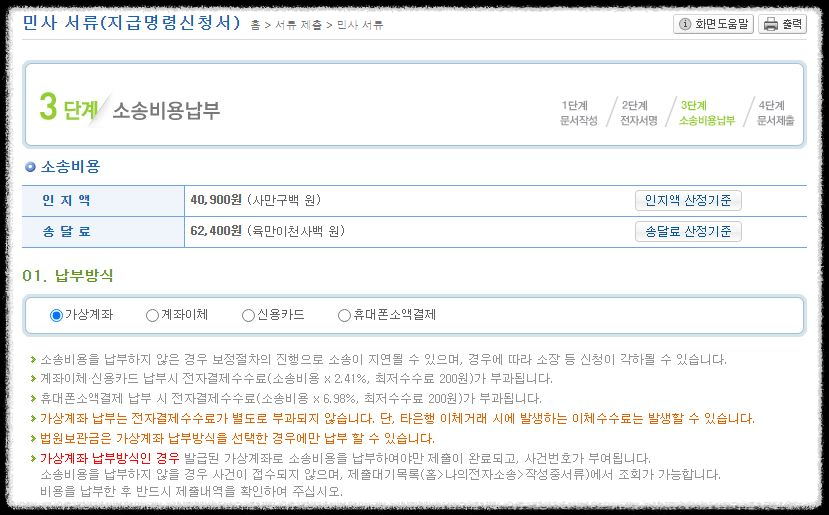 이를 확인하고 가상계좌번호에 소송비용을 납부까지 완료하면 자동으로 법원에 제출되어 집니다.