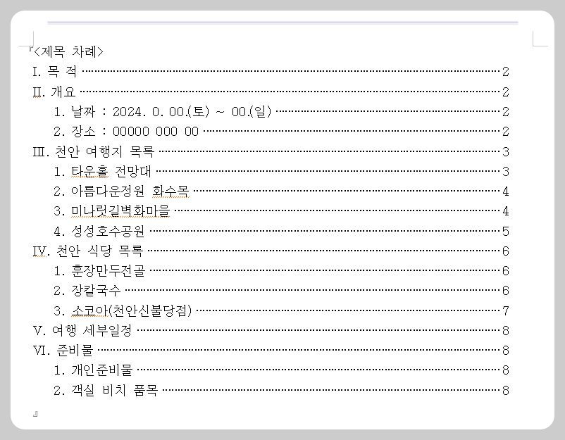 (실제 본인의 작업 파일로 차례를 만들때에는 원하는 개요 수준으로 선택하세요)
