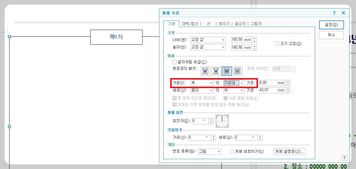 '개체 속성'상자가 나타나면, '위치'에서 '가로'를 '쪽의 가운데' 기준으로 변경합니다.