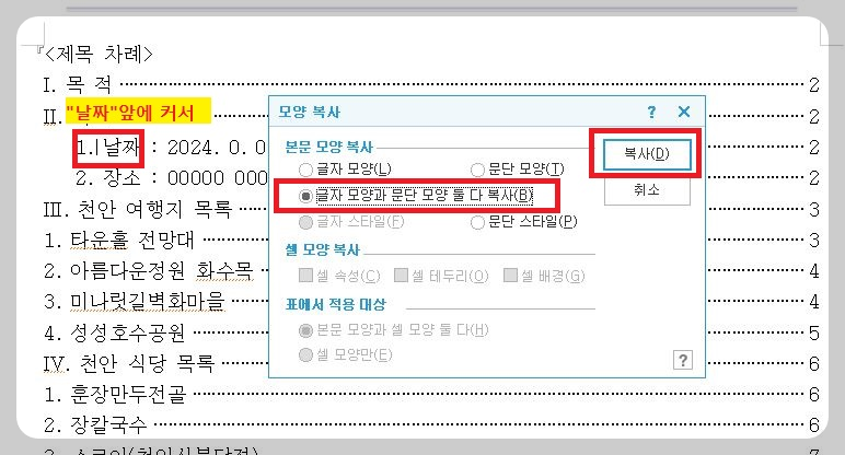 그리고 '글자 모양과 문단 모양 둘 다 복사'를 선택 후 '복사'버튼 클릭!