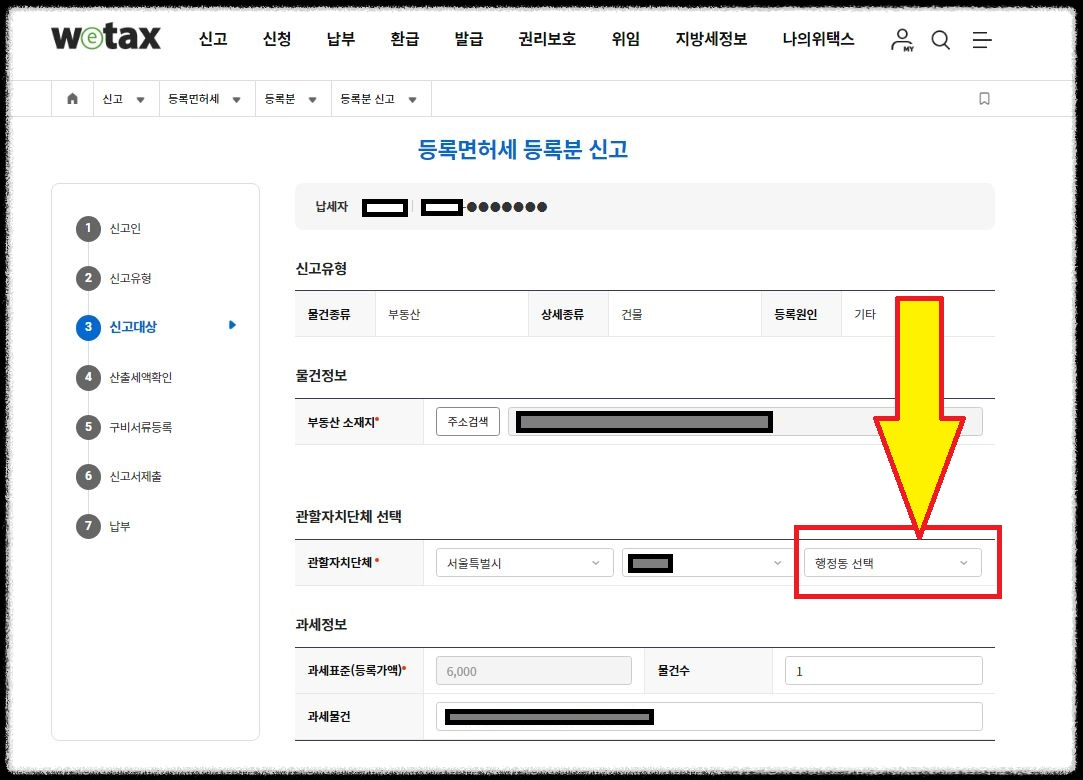 '관할자치단체 선택'에 '행정동 선택'이 있는데, '물건정보'에 입력한 주소를 관할하는 지방자치단체를 선택합니다.
