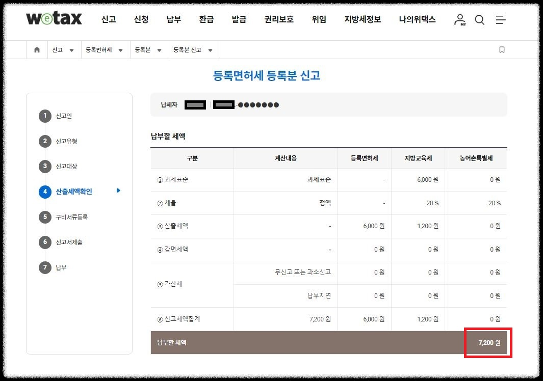 ⑥ '산출세액'을 7,200원을 확인합니다.