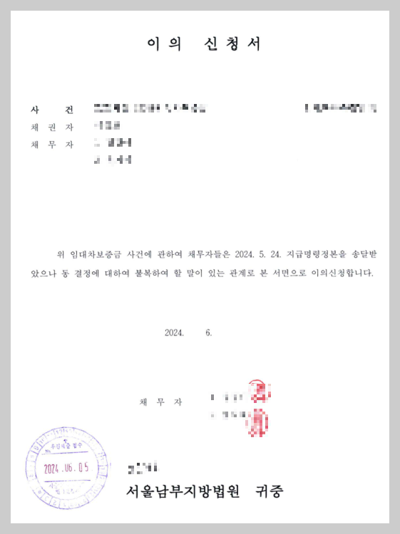 2024. 5. 1. 지급명령신청서를 제출하고, 상대방이 같은 해 6. 5. 지급명령 이의신청서를 제출했어요.