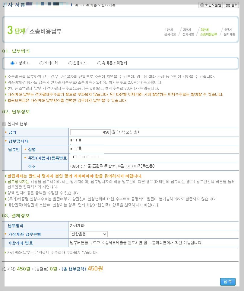 그리고 인지액과 송달료를 납부하는 화면이 나오는데, 총 450원이 들어가네요