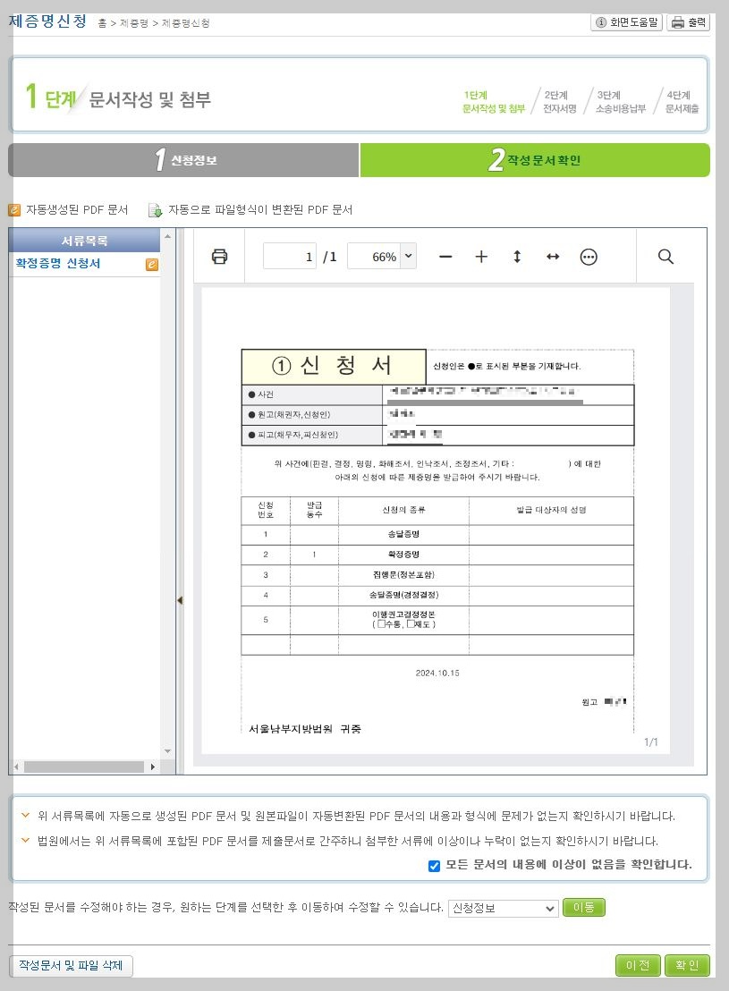 확정증명 발급통수 1로 되어 있는 것을 확인하고 다음으로 넘어갑니다.