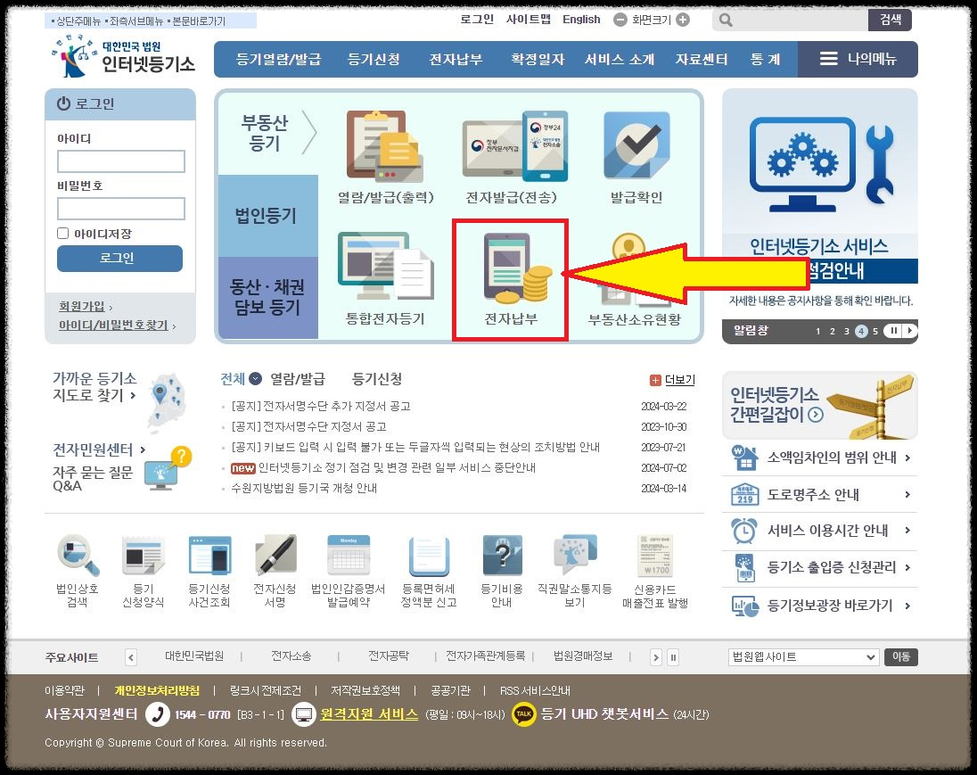 ① 인터넷등기소(http://www.iros.go.kr/PMainJ.jsp)에 접속하고, 먼저 로그인을 한 후 '전자납부'를 선택합니다.