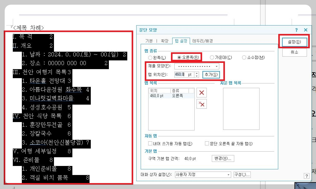 '탭종류'는 오른쪽 선택 및 '채울 모양'은 점선으로 선택, '탭위치'는 460pt로 변경하고 '추가'버튼 및 '설정'버튼 순으로 클릭합니다.
