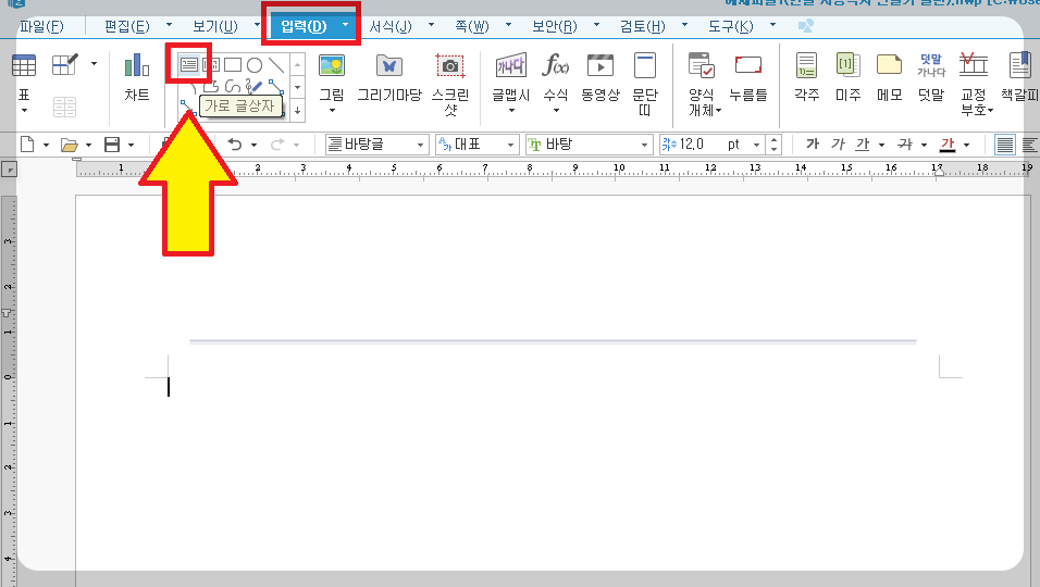 1) [입력]-[가로글상자]를 선택하여 적당한 크기로 만들어줍니다.